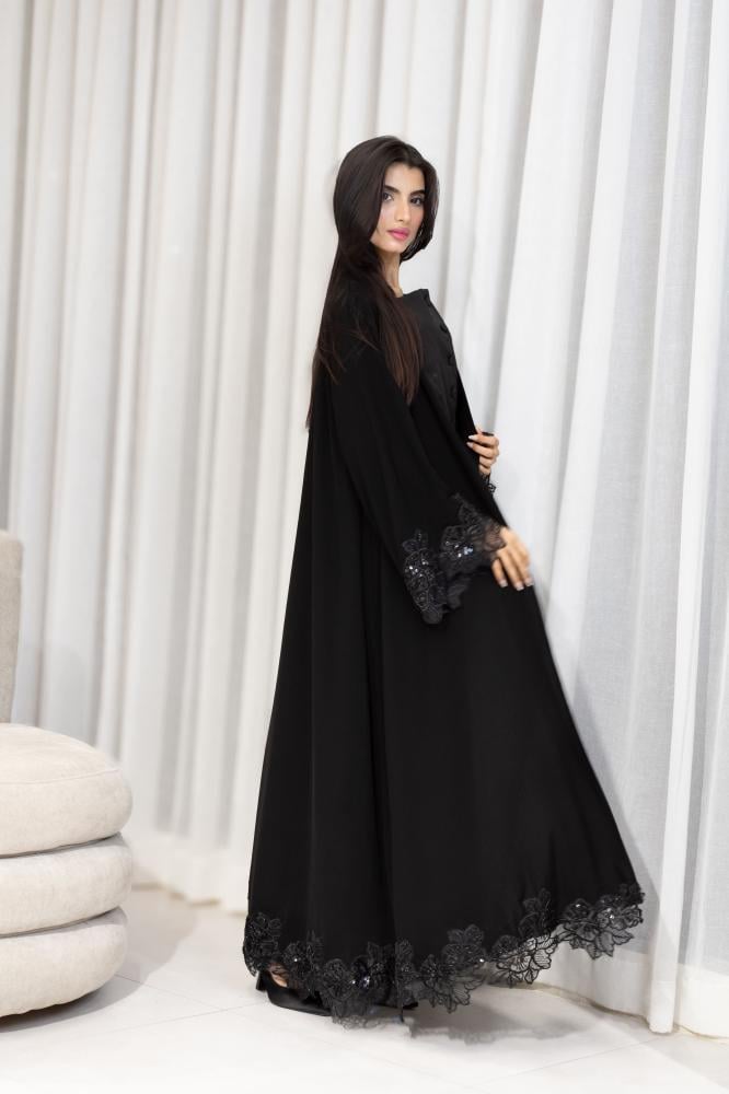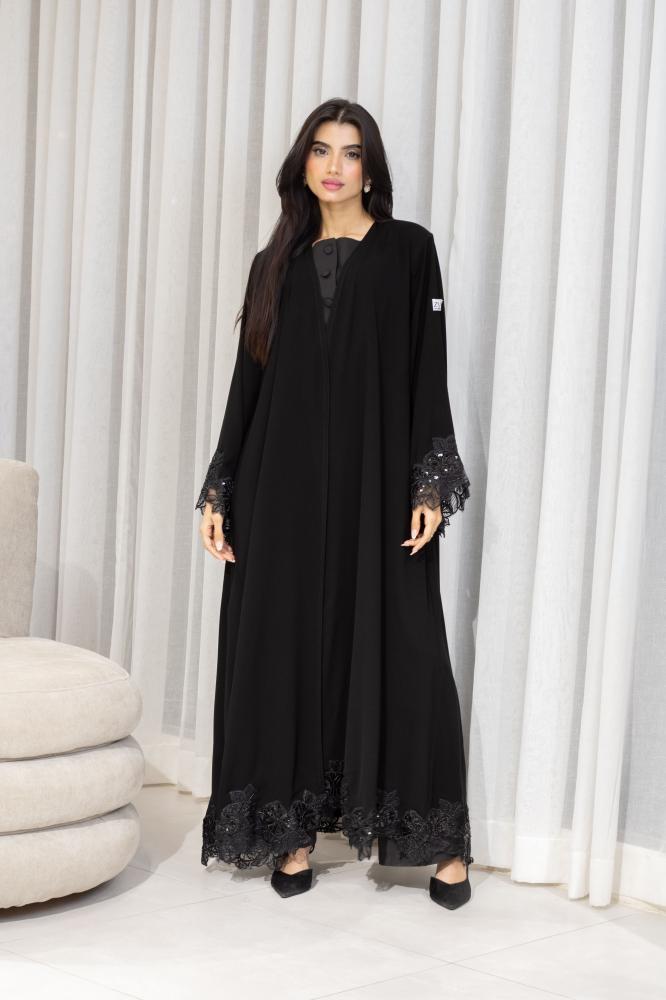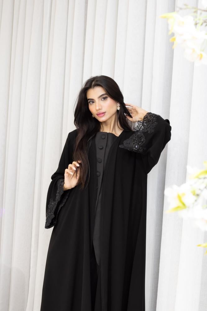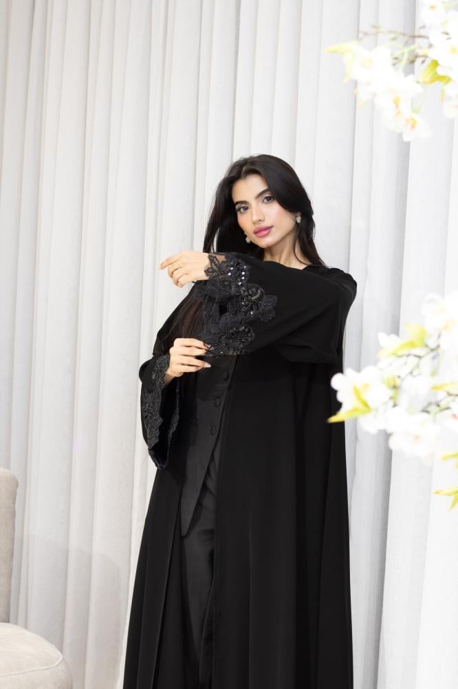 عباية نصف كلوش Z 34 تجمع بين الفخامة والراحة بتصميم نصف كلوش يضفي على الإطلالة انسيابية راقية تناسب مختلف المناسبات بينما يأتي القماش الملكي الكوري ليضيف ملمسًا ناعمًا وجودة فاخرة تبرز جمال التصميم وتكتمل أناقة العباية بفضل كلفة الخرز الأسود ذات الجودة العالية والتطريز المنفذ